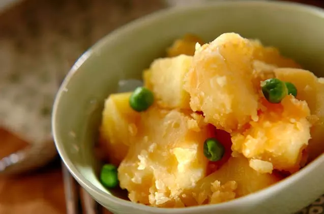 手順4:器に盛り、グリンピースを散らす。甘くて、ホクホク感があるキタアカリ、男爵薯などの品種が向いています。