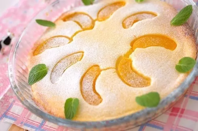 - バターをぬった型に1を流し入れ、黄桃を並べて180℃に予熱しておいたオーブンで30分焼く。竹串を刺して、何もついてこなければOK。冷めたら粉糖を振ってミントの葉を飾る。(水きりしたヨーグルトの作り方)…コーヒーフィルターなどにプレーンヨーグルトを入れて、冷蔵庫で3時間~半日ほど固くなるまで水気をきる。