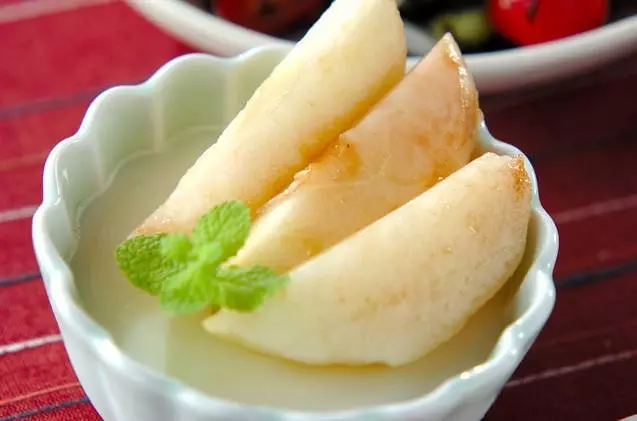 - トロミがついたら、ピーチリキュールを加えて混ぜ合わせ、冷やしておいた器に流し入れる。1時間以上冷蔵庫で冷やし固め、ミントの葉を飾る。