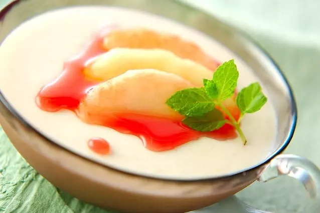 - (2)が温かいうちにふやかしたゼラチンを加えて溶かし、残りの牛乳を加える。桃を加えて鍋の底を氷水にあてながら、トロミがつくまで混ぜながら冷やす。