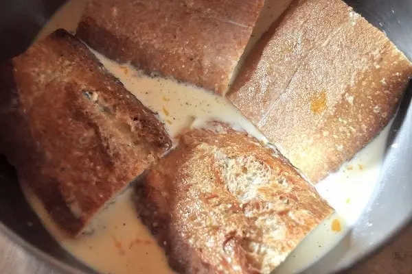 ・大きめのボウルで<卵液>の材料を混ぜ合わせ、幅半分、高さ半分に切ったバゲットを入れる。途中で上下を返して一晩浸す。