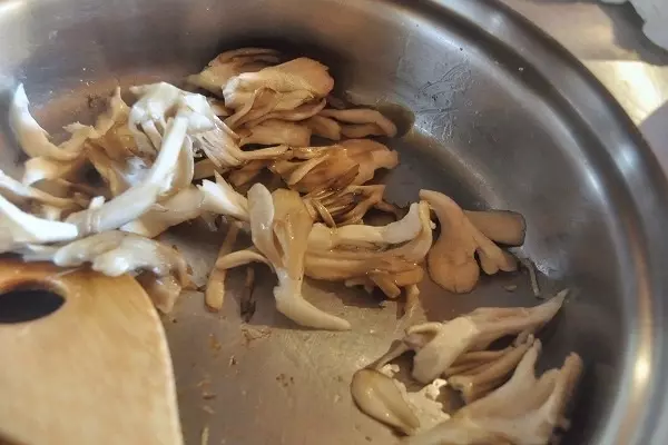 1、マイタケは食べやすい大きさに裂き、サラダ油を熱したフライパンで炒める。しんなりしたら塩で調味する。