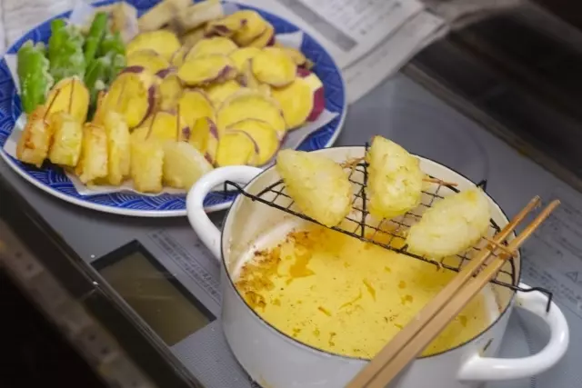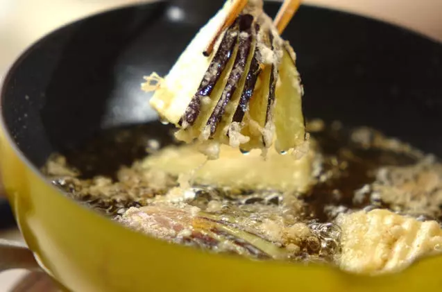 手順3:カボチャが揚がったら(油の温度は170℃位になっています)、他の具も<衣>に通して油に入れ、サクッと揚げて油をきる。