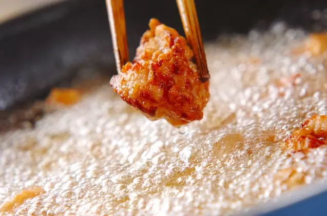 手順2:170℃の揚げ油に静かに入れ、ジュワジュワという大きな泡が出ていたのが、シュワシュワと小さな泡になり、おいしそうなキツネ色になったら、油をきる。