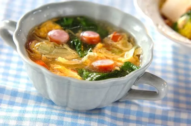 たっぷりのレタス、ソーセージ、溶き卵のスープです。レタスは最後に加えてシャキシャキ感を残すのがポイント!