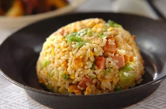 - 焼豚を加え、顆粒中華スープの素と塩コショウで味を調える。レタスを加え、鍋肌からしょうゆをまわし入れてサッと炒め合わせ、器に盛る。
