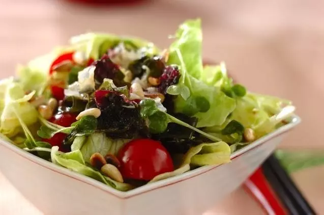 - 食べる直前にレタス、貝われ菜を<ドレッシング>と混ぜ合わせて器に盛る。海藻サラダも<ドレッシング>にからめて盛り合わせ、プチトマトを添えて松の実を散らす。