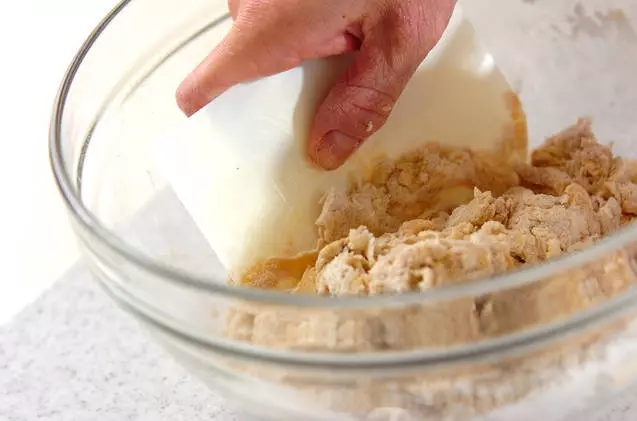 1、ボウルに強力粉、薄力粉を入れ、インスタントドライイースト、砂糖、黒糖、スキムミルクを真ん中におく。塩、卵黄をはしにおき、温めた水70~80mlをかけ、カードでひとまとまりになるまで混ぜる。