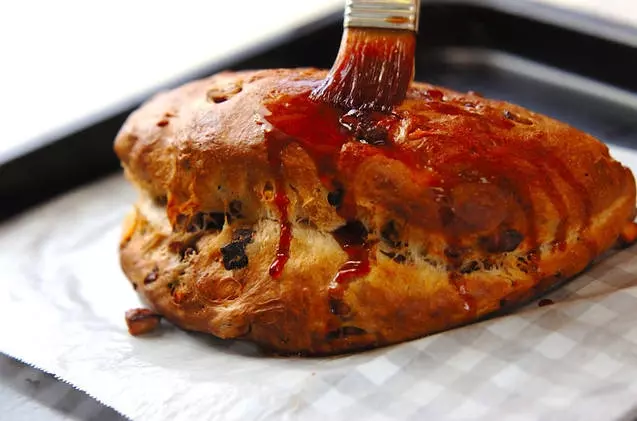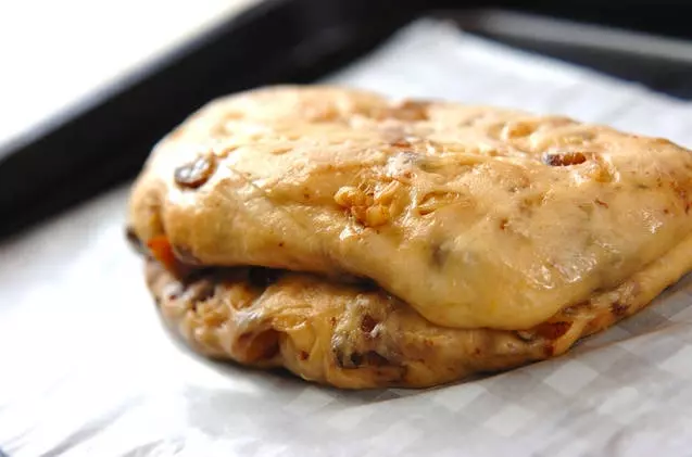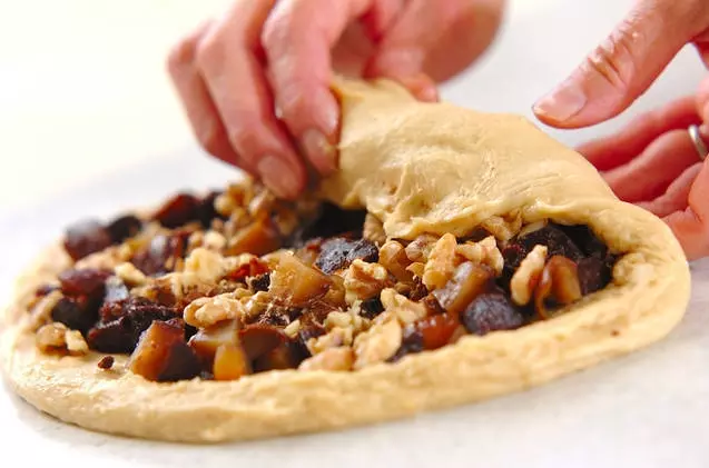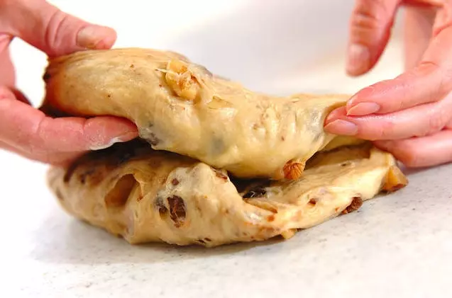 2、ひとまとまりになったら、無塩バター50gを加えて生地を台の上に出し、こねる。表面が少しなめらかになったら生地を広げ、<具材>の材料を混ぜ込む。温かいところに置き、約2倍に膨らむまで待つ(25~35分)。