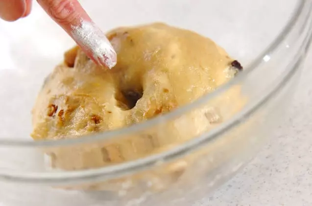 3、指に分量外の強力粉をつけてパンに穴をあけ、そのままの穴が残るか確認をする(フィンガーテスト)。ガス抜きをして丸めなおし、ベンチタイム10分。