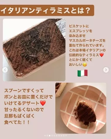 食べた感想は「もぉ、すごーーーく美味しかったです」とichicoさん。「エスプレッソを染み込ませたビスケットが入ったティラミス。ふわふわのマスカルポーネチーズのクリーム。甘すぎなくて美味しくて食べすぎる。見つけたら冷凍できるので、ぜひチャレンジしてみて」といいます。