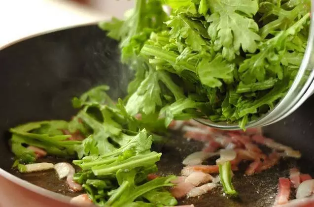 春菊をニンニクとベーコンでサッと炒めた「春菊のガーリック炒め」。味付けはベーコンの塩味のみのシンプルレシピ。春菊は火が通りやすいので手早く炒めるのがポイントです。