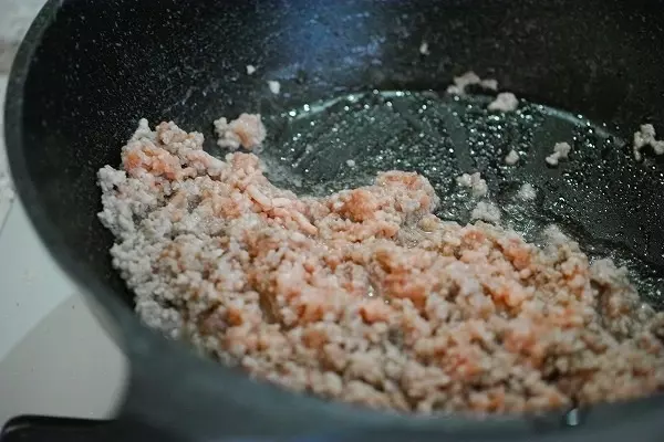 ごま油と一緒に、豚ひき肉を炒めていきます。