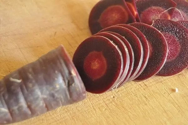 ニンジン自体も主流の赤いニンジンだけでなく、黄、紫、黒、それらの間引きニンジンなど色も形も様々で、器にアクセントを添えてくれます。「紫ニンジン」は輪切りにすると中心がオレンジ色や白色で模様がきれいですが、酢で調味したり加熱をすると全体が濃い紫へ変色してしまいます。