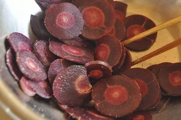 1、紫ニンジンは薄い輪切りにしてボウルに移し、塩をからめて15分置く。