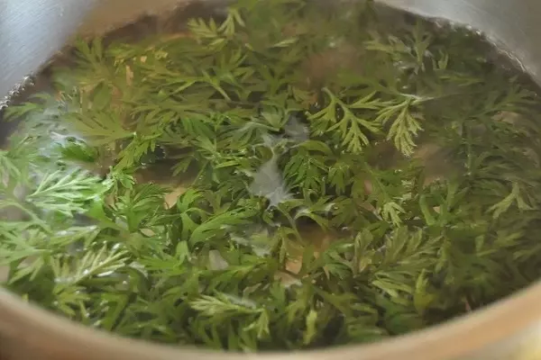 2、ニンジン葉は茎から葉をつみ取り、分量外の塩でゆでて水に取り、粗熱が取れたら水気を絞る。
