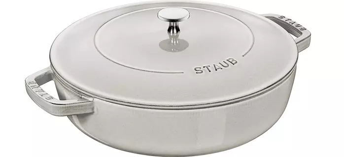 口が広く浅型のブレイザー・ソテーパンは、広い底面を活かした「焼いてから煮る」料理が得意な鍋。具沢山の炊き込みご飯やパエリアもきれいに具を並べられます。浅型なので、おでんやすき焼き、寄せ鍋などテーブル上で取り分ける鍋料理にも。魚を切らずに入れられるのでアクアパッツァにもおすすめです。「ブレイザー ソテーパン」カンパーニュ / 26cm