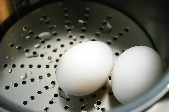 早速、付属のレシピ本に載っている「手羽元と卵のさっぱりお酢煮」を作ってみました。最初に、付属の蒸し台の上に卵を乗せて、ゆで卵を作ります。