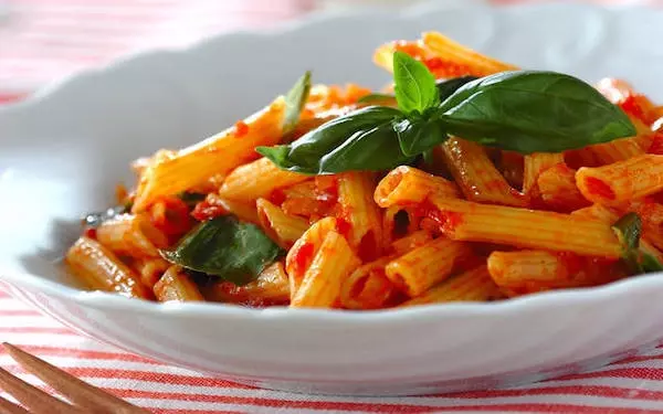 ショートパスタの代表選手「ペンネアラビアータ」。美味しさのポイントは、オリーブオイルでじっくりニンニクを炒めること。ニンニクが効いたオイルが、トマトの酸味と玉ネギの甘みをより芳醇に引き出してくれるのです。