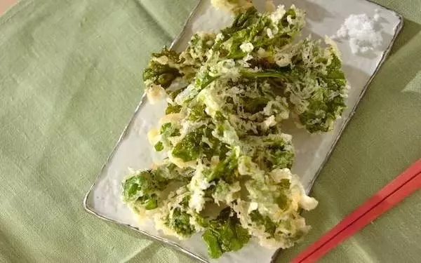 サックサクの食感の「菜の花の天ぷら」。春を感じる大人な天ぷらは、塩をちょこんとつけると美味!