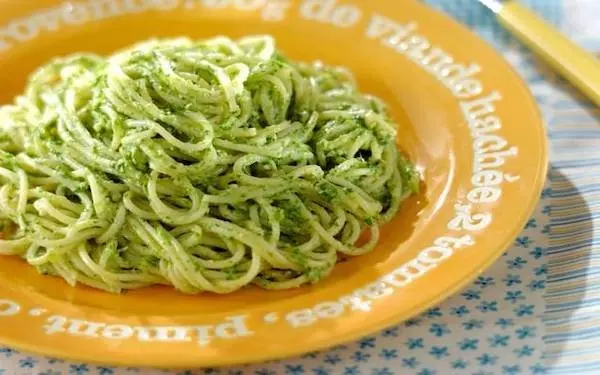 菜の花、松の実などをミキサーで撹拌してジェノベーゼ風に仕上げた「菜の花パスタ」。少し多めにソースにしておきオムレツや、ポークステーキと合わせても美味しいです。