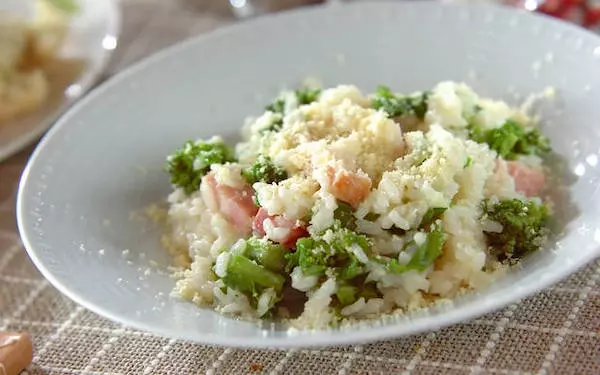 菜の花のほろ苦さとベーコンの塩味を牛乳とバターで優しく包んだ「菜の花とベーコンのリゾット」は優しく体を温めてくれます。朝ごはんにもオススメです。