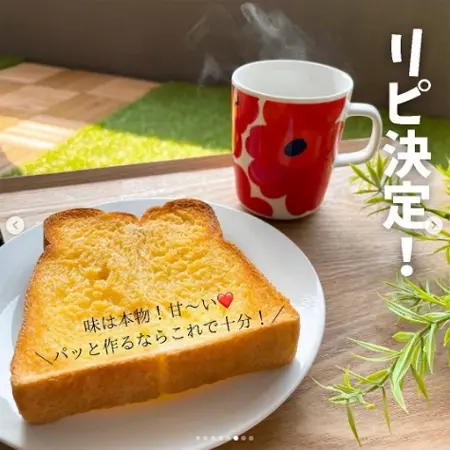 食事系のパンのお供もいいけど、たまには甘~い朝食も食べたくなるという人には、こちらのパンのお供はいかがでしょう。インスタグラマーのshirokuma_house_さんこと、Shirokumaはうすさんがおすすすめするのは、「私のフレンチトースト」。パンにぬって焼くだけでフレンチトーストの味が楽しめるというもの。