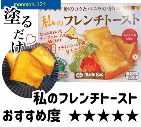 もうひとり、インスタグラマーのmonmon.121さんこと、モンモンさんも最近のお気に入りとして「おすすめ度は☆5つ」と紹介しているのが、この「私のフレンチトースト」。