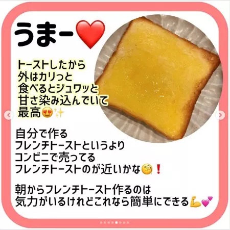「カロリーが怖いけど、たっぷりぬってたっぷり朝から幸福感じています。外はカリっと、食べると甘さがジュワッっと染み込んでいて最高。朝からバニラが香るおいしいフレンチトーストが食べられてうれしい」といいます。