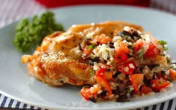 オリーブ、トマト、玉ネギをみじん切りにしたソースがチキンソテーを爽やかに仕立て上げます。白身魚のソテーにも合いますよ。少し焼いたバケットに乗せたら、ブルスケッタに。