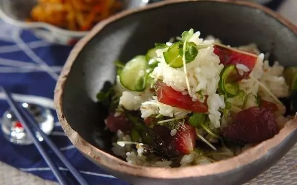 しょうゆとみりんで漬け込んだカツオはねっとり食感が美味しいですね。その漬けカツオをキュウリと一緒に酢飯に混ぜ込んだ、とっても大人な「漬けカツオ寿司」。
