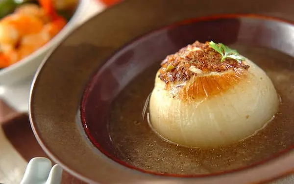 ・「新玉ネギのひき肉詰め煮」