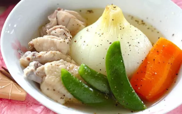 鶏肉から出たエキスで美肌になれちゃうコラーゲンたっぷりの新玉ネギのスープ煮。クスクスやショートパスタを添えれば主食級の一皿になりますよ。