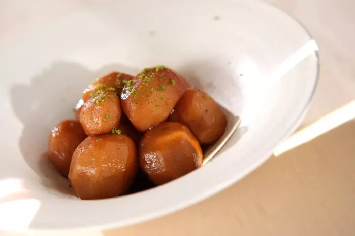 里芋をしょうゆベースの甘辛ダレでコトコト煮込んだ煮物は、白いご飯にぴったり。ポイントは強火で汁気を飛ばすように煮込むこと。中心まで味が染み込んだホクホクジューシーな煮物は、白いご飯のお代わり必至。
