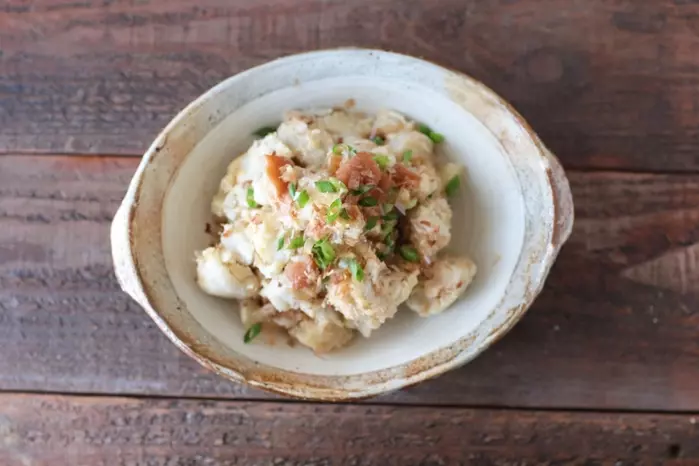 ねっとり甘い里芋を潰しマヨネーズ、鰹節、梅干しと和えた和風ポテトサラダ。里芋独特の粘りが梅干しと鰹節をキャッチし満足感たっぷり。焼き魚やお刺身、シンプルな豚や鶏肉のソテーなどの副菜にオススメです。
