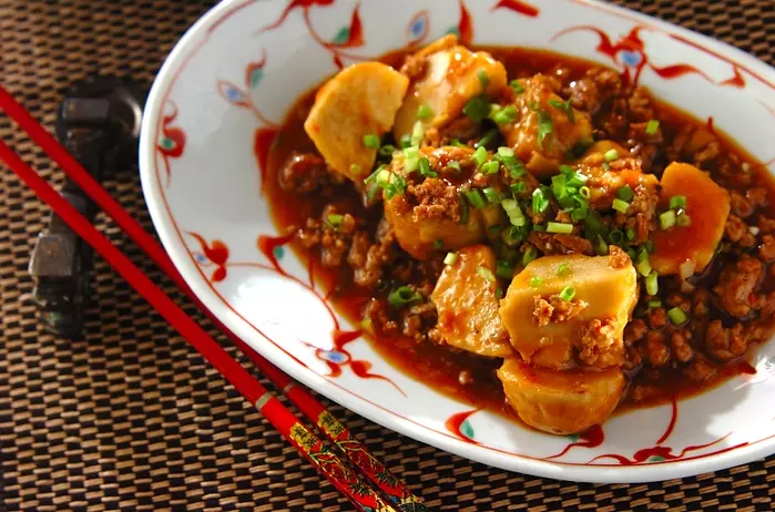 定番のお豆腐を里芋に変え食べ応えがアップした白いご飯にぴったりのおかず。辛く炒めたひき肉で里芋のトロミをキャッチ。里芋は、こんな風に和洋中色々使える便利食材。何を作ろうか迷ったときにオススメの一品はお弁当にも使えます。