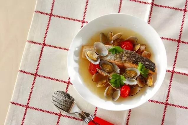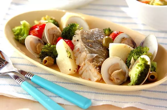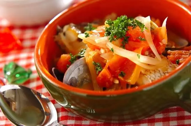 ハマグリの旨味たっぷり!ジャガイモやタラの切り身も入った、ヘルシーで栄養満点の一品です。プチトマトは最後に加え、くたっと柔らかくなるまで煮込みましょう。