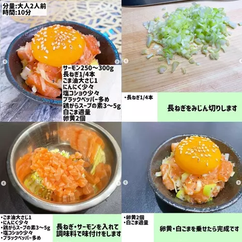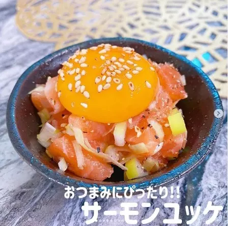 所要時間はたったの10分!「とても簡単にできて、おつまみにぴったりなのでおすすめ!」というあぴさん。生のサーモンに加えて、卵黄のとろりとしたまろやかな味とごまの風味が加わり、よりおいしさが引き立つ一品というので、ぜひ試してみるといいでしょう。