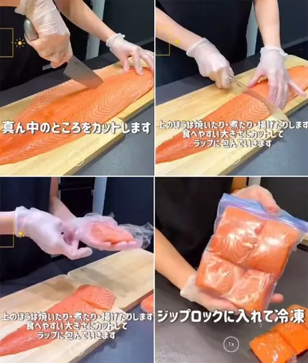 「輸入物のサーモンはノルウェー産が品質も安全性もダントツなので、コストコのサーモンは本当におすすめ」とあぴさん。手に取るとずっしり重く、肉厚でかなり大きいので、買ってきたら新鮮なうちに、使いやすいように切り分けるところからスタート。上手に切り分ける方法を教えてくれています。