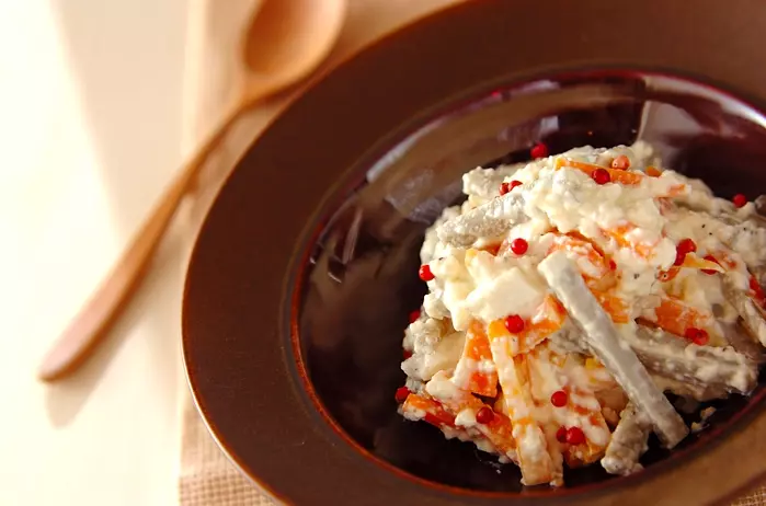 ゴボウとニンジンといえばキンピラですが、ちょっと趣向を変えて洋食の副菜に豆腐とケッパー、マヨネーズで和えた洋風白和えはいかがですか。根菜類がたっぷり摂れるうれしいレシピです。