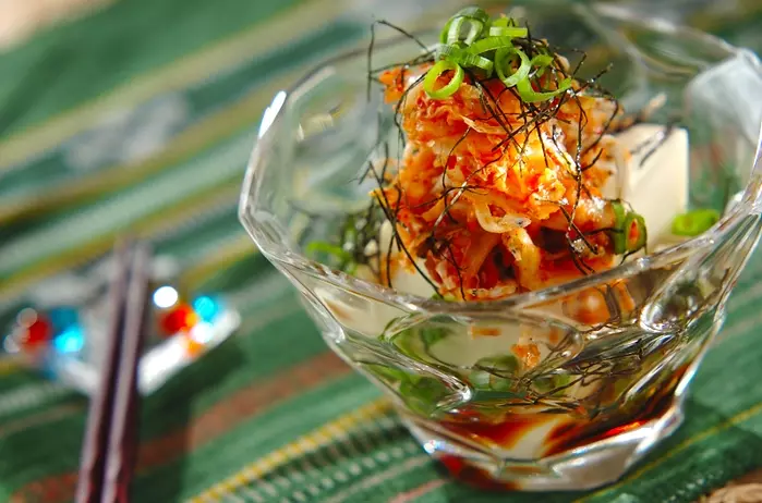 キムチを乗せた定番冷や奴はチリメンジャコがプラスされていてカルシウムも摂れます。涼やかな器に盛り付けて美しく魅せましょう。ごま油をかけると旨味がアップ!ビールや焼酎のお供にオススメです。