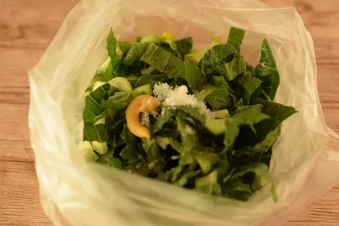 1、刻んだ小松菜をビニール袋に入れ、(A)の調味料を加える。ビニール袋の外側からしっかりもみ、味をしみこませたら、水分と灰汁をしっかり絞る。水分を絞り出したら、しばらく置く。