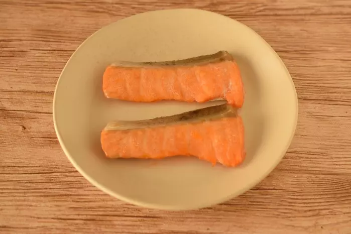 2、鮭は2等分にし、魚焼きグリルかオーブントースターなどで、両面を焼く。