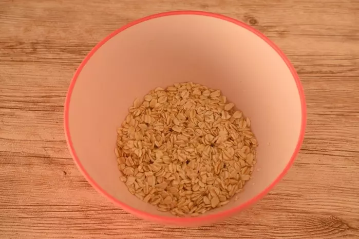 4、耐熱容器に分量のオートミールと水を入れ、混ぜ合わせる。ラップをかけ600Wの電子レンジで3分加熱する。