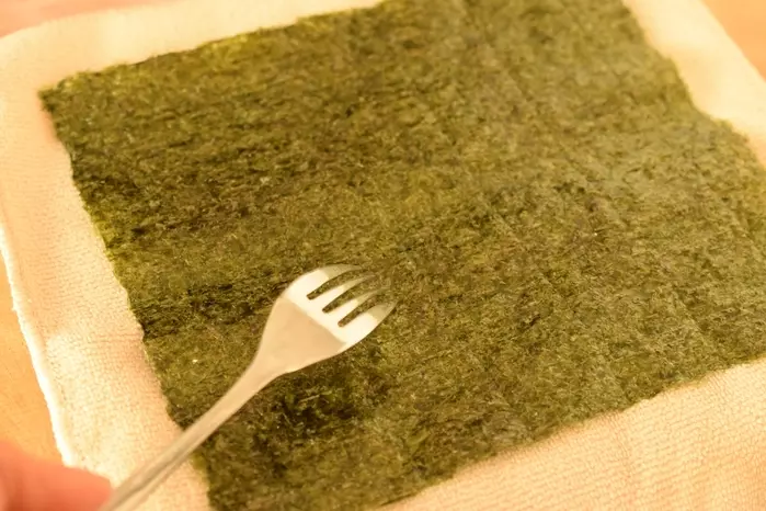 5、まな板に乾いたふきんを置き、上にラップをかける。海苔を置いて、フォークなどで数か所穴をあける(※海苔がちぎれやすく食べやすくなります)