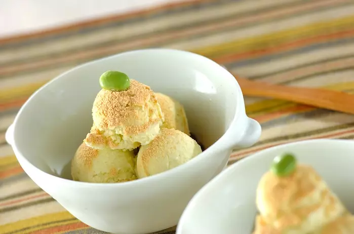 ちょこんと乗せた枝豆がかわいいずんだアイスは豆乳を加えることでヘルシーに。サラサラとふりかけたきな粉が高級感を演出してくれます。初夏にふさわしい涼しげなレシピです。