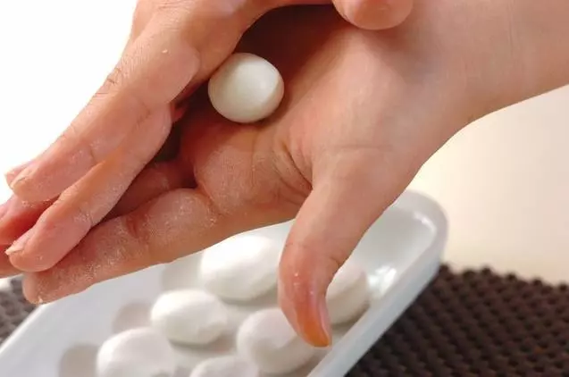 2、<白玉団子>の白玉粉をボウルに入れ、水を少しずつ加え、まとめやすいかたさに練り、食べやすい大きさの団子に丸める。