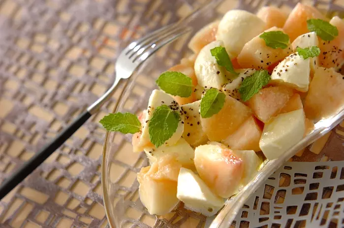 スパークリングワインやキンキンに冷やした白ワインのお供にピッタリなフルーツとチーズのマリアージュ。これから旬を迎える桃の登場が楽しみになるレシピです。