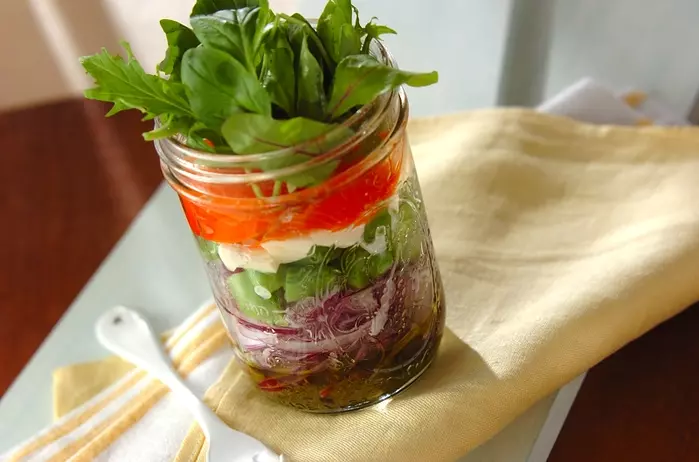 スモークサーモンとモッツァレラと好みの野菜を交互にガラスジャーに詰めていきます。保冷剤と一緒にピクニックやバーベキューに持っていくと喜ばれます!