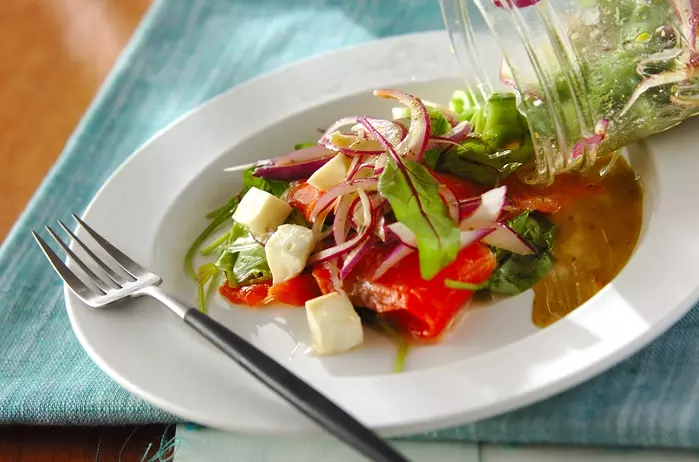 味付けは塩コショウとオリーブオイルだけ。モッツアレラチーズの定番レシピ。フレッシュバジルやドライオレガノをプラスして極細パスタのカッペリーニに絡めても◎。